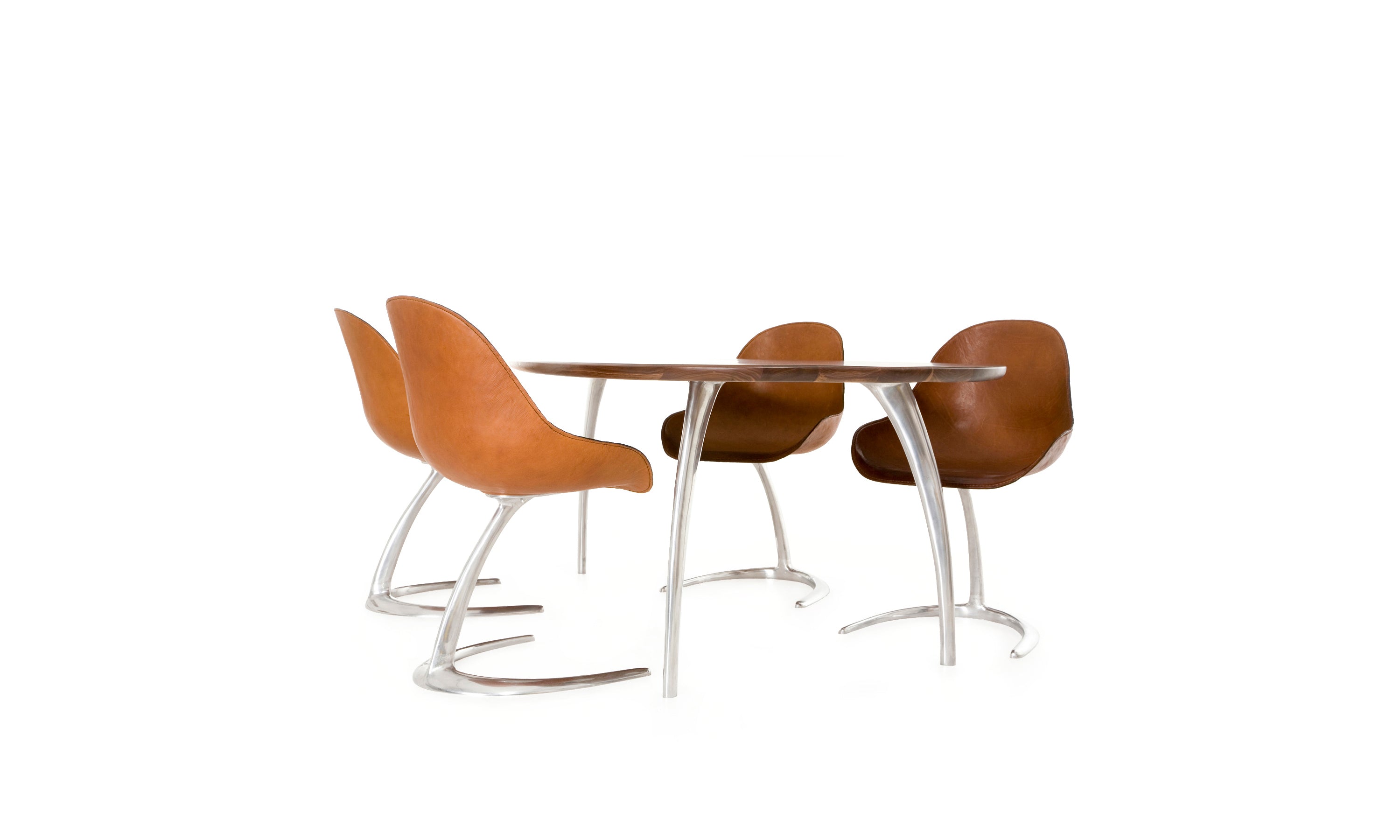 The curving leg of the dining table compliments the stem of the chair. The table top can take many shapes, from aerofoil or amoeba shapes to more formal rectangles. It can be made in solid Oak or Walnut or in a corporate environment, the table top can be finished in leather.