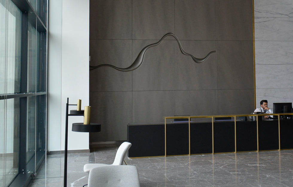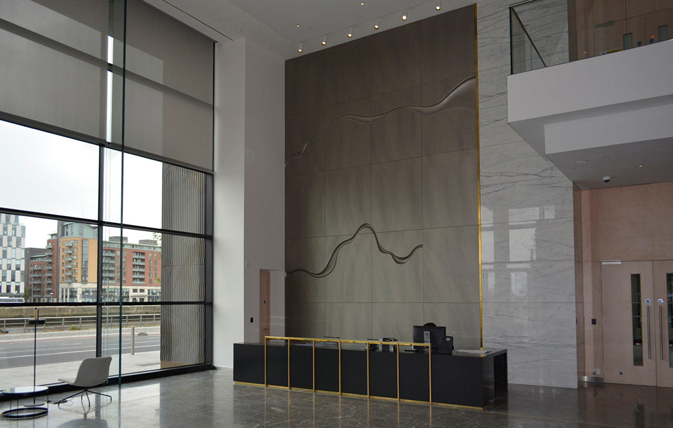 This leather artwork was commissioned by Ballymore, the developer of Dublin Landings. This is a prestigious development alongside the River Liffey in the Dublin Docklands area. The artwork was an original concept by Arrow Architects in Denmark & RKD Architects in Dublin.