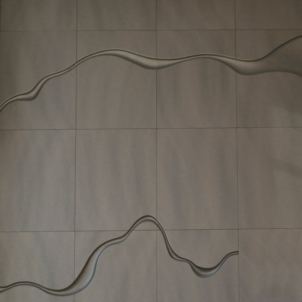 The brief was to interpret the course of the River Liffey, from its source in the Wicklow mountains as it winds through Kildare and out to sea at Dublin Bay. It was decided to recess a stylised channel back into the wall of leather panels.