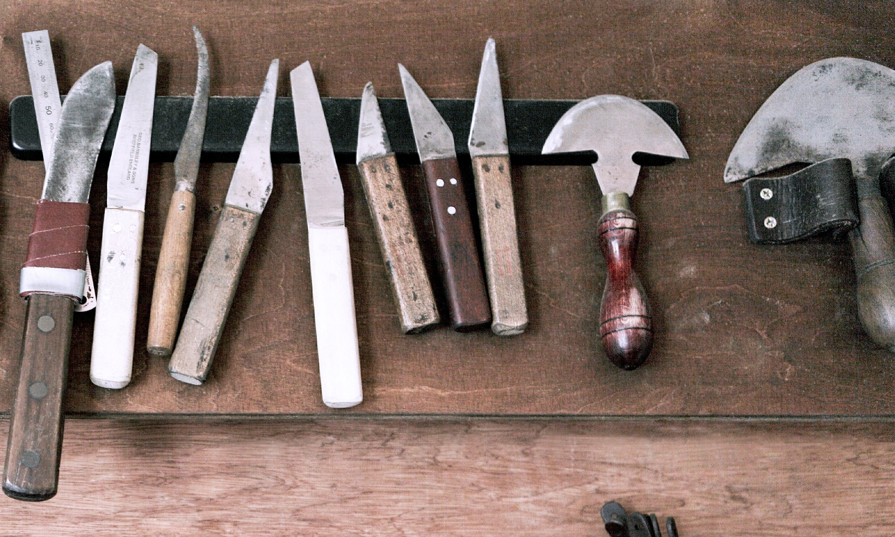 We hold a remarkable collection of hand tools—each chosen for its precision and efficiency. A wide selection of knives, edge bevelers, punches, burnishers, and more; these tools reflect years of refinement and dedication to the leather craft. Nearby spaces also house patterns, templates, dies, and specialized machinery that support the process.