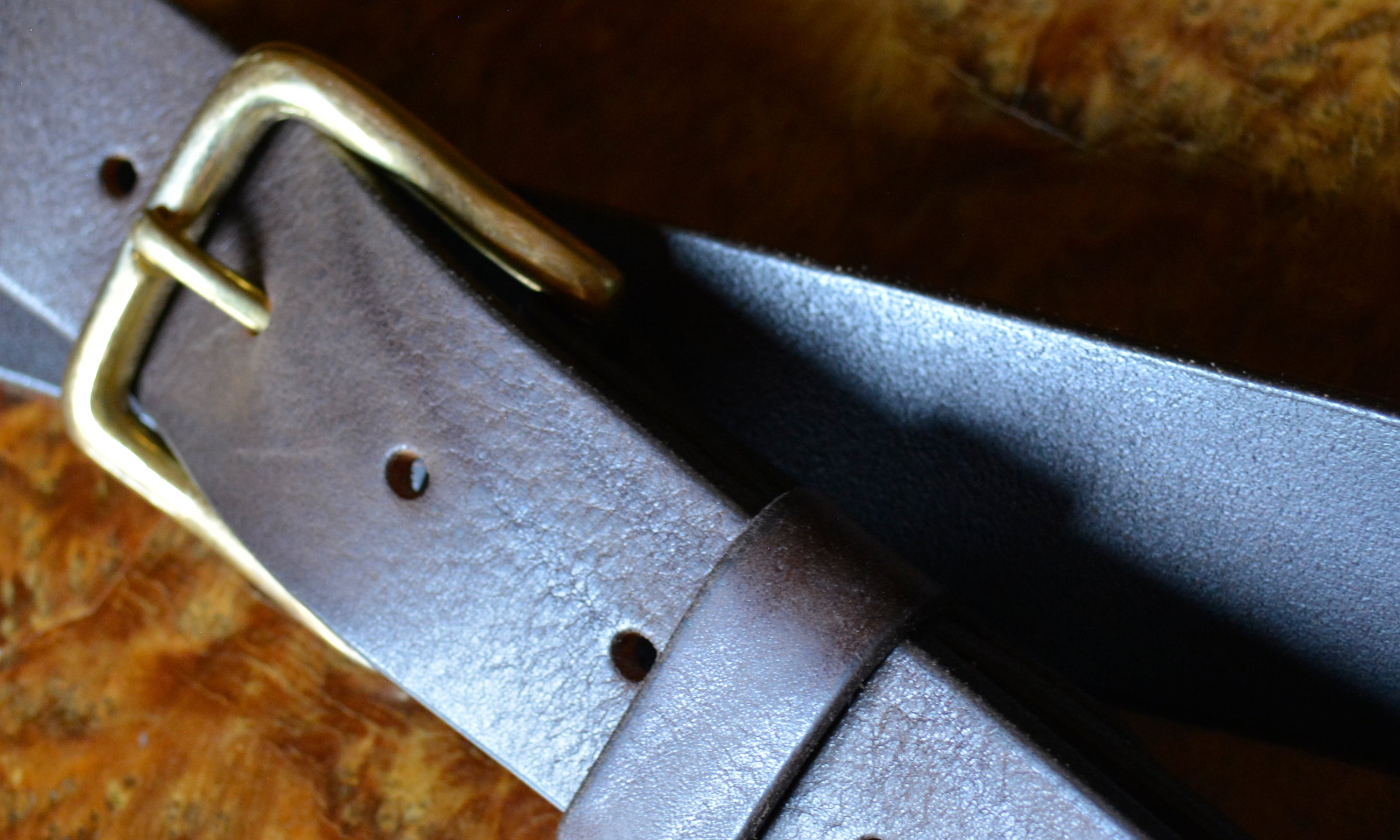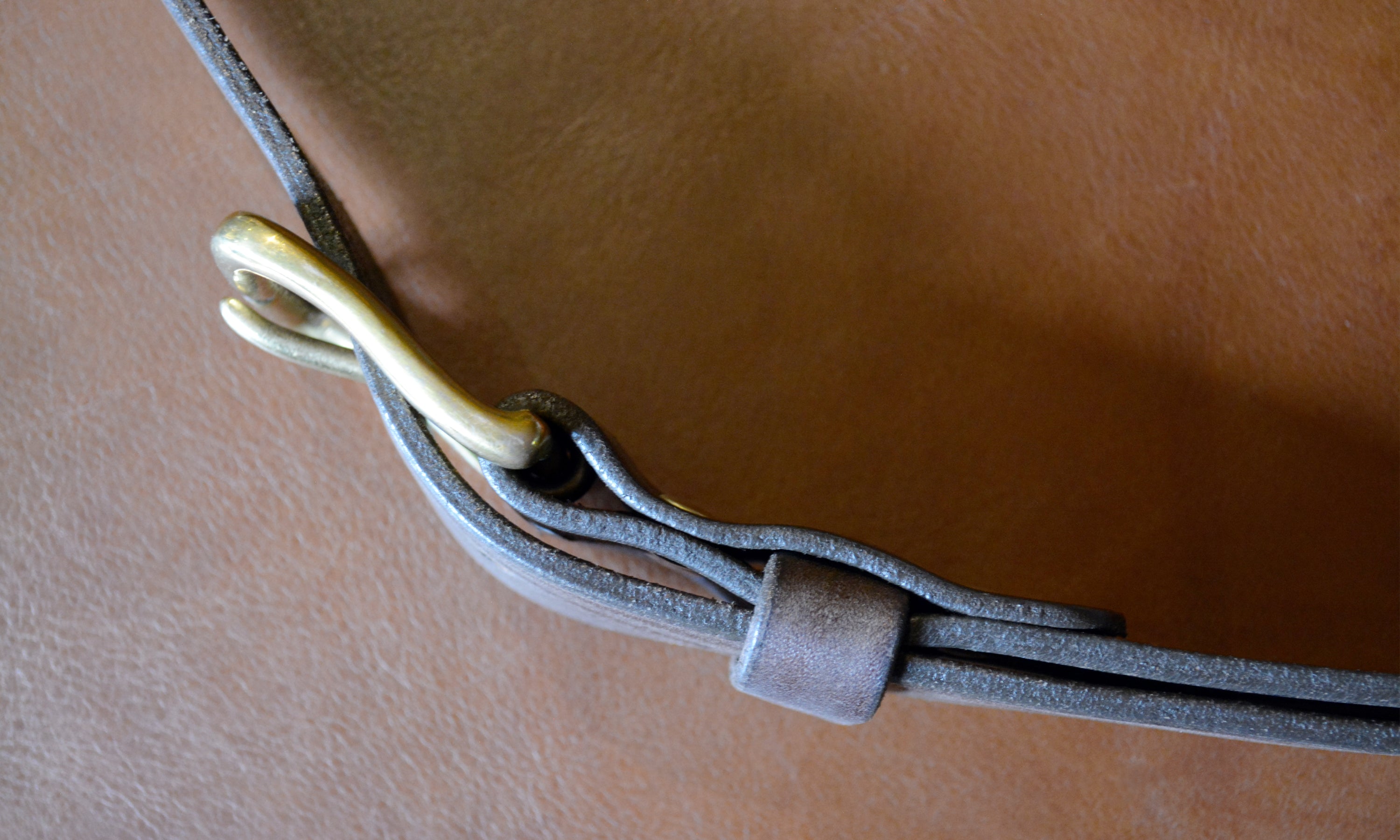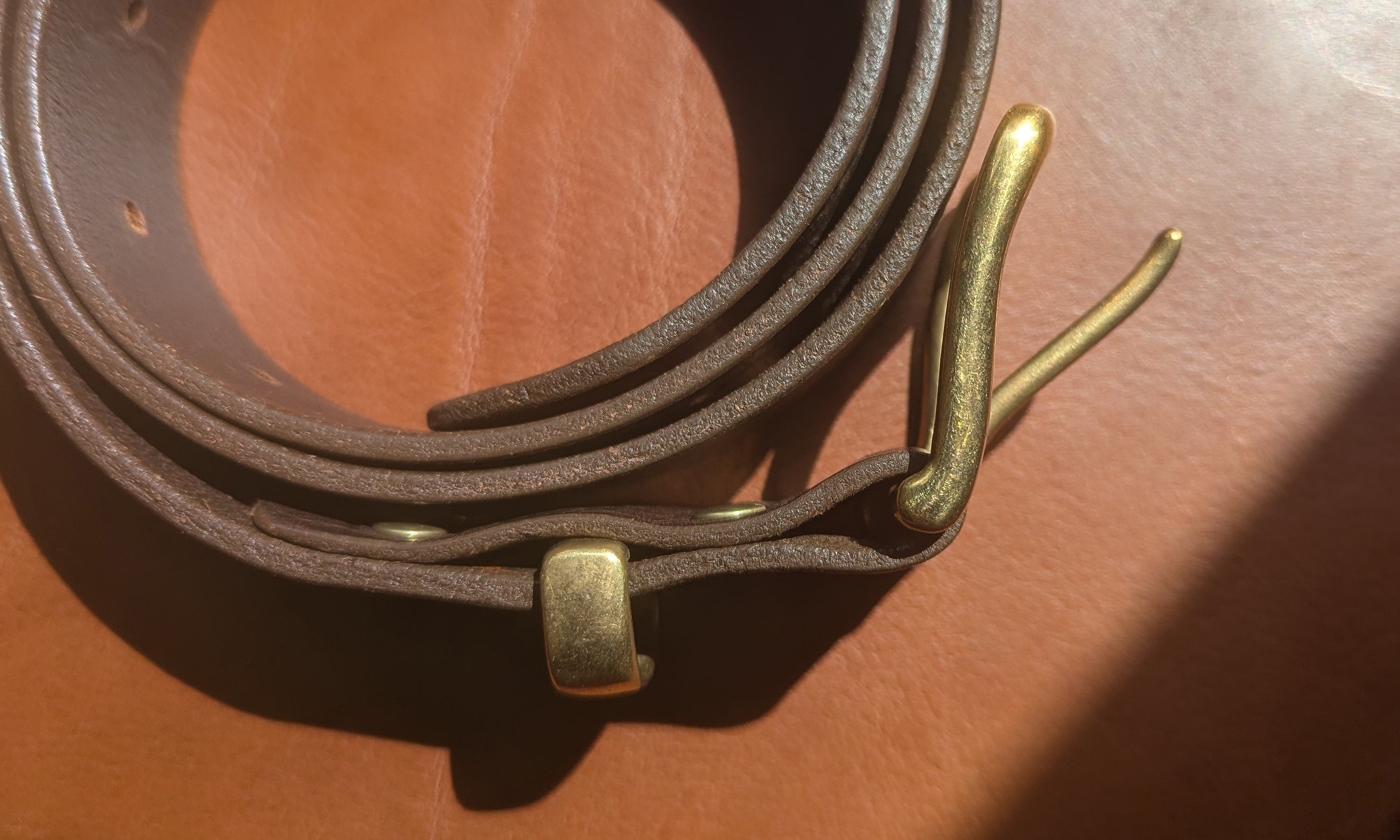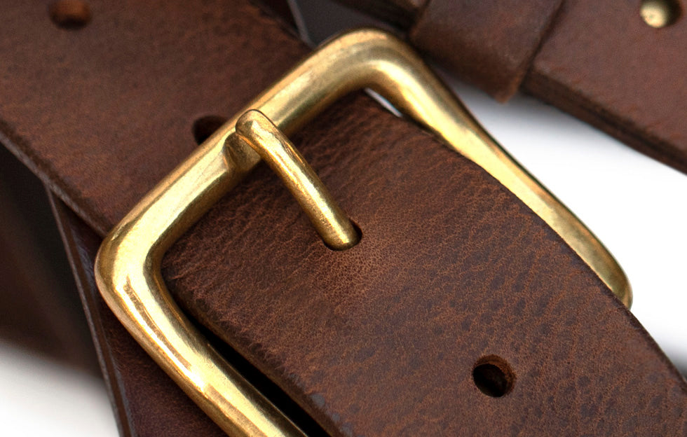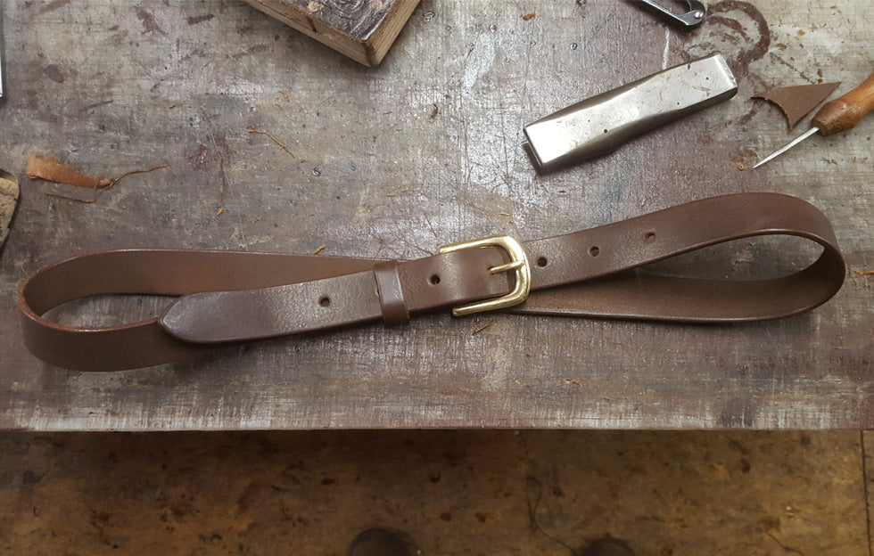 Handmade leather belts with solid brass buckles.