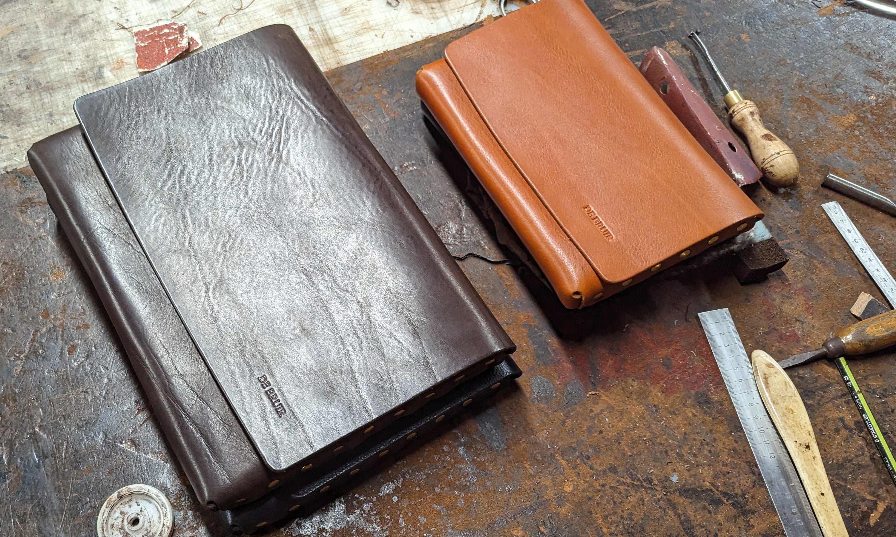 A very casual style notebook cover. The wrap holds a book securely in place within it and includes a pocket for loose page and notes. A slot on the side fits a pen or pencil.
