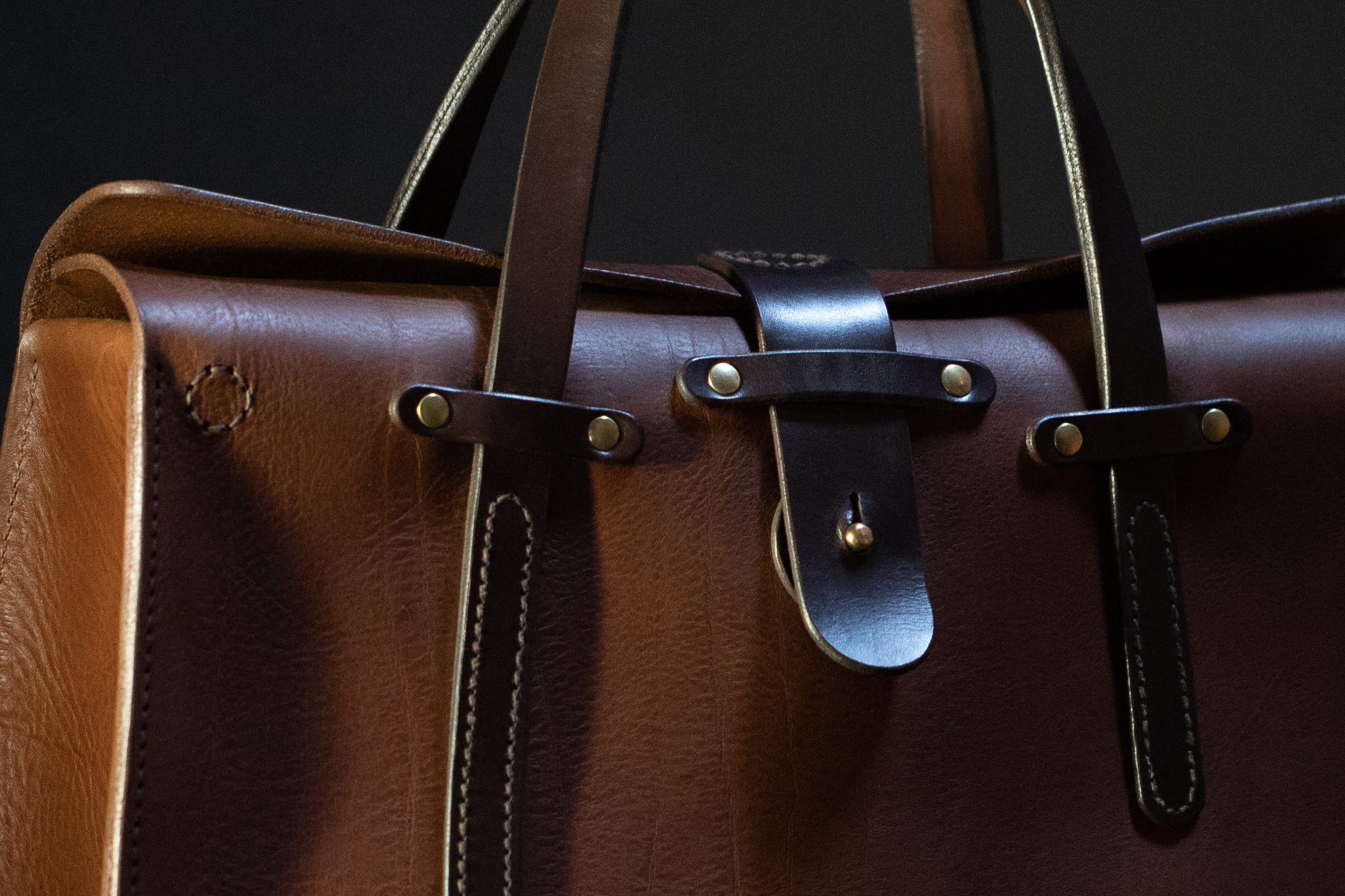 This is a large capacity workbag with a vintage stud closure.